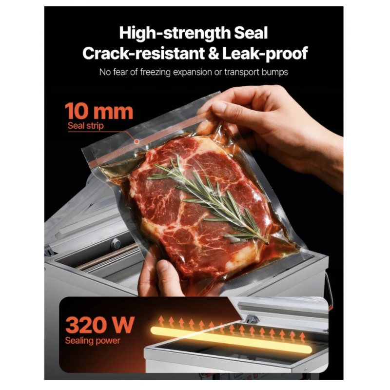 Sistema de vacío potente que alcanza una presión final de hasta 1 kPa. Campana de gran capacidad de 40 × 40 cm que permite sellar productos de gran tamaño o varias bolsas simultáneamente. Construcción robusta en acero inoxidable, fácil de limpiar y resistente al desgaste. Control semi automático con ajuste de tiempo de vacío y sellado. Certificaciones ISO y CE que garantizan calidad y seguridad. Doble barra de sellado para mayor eficiencia y productividad.