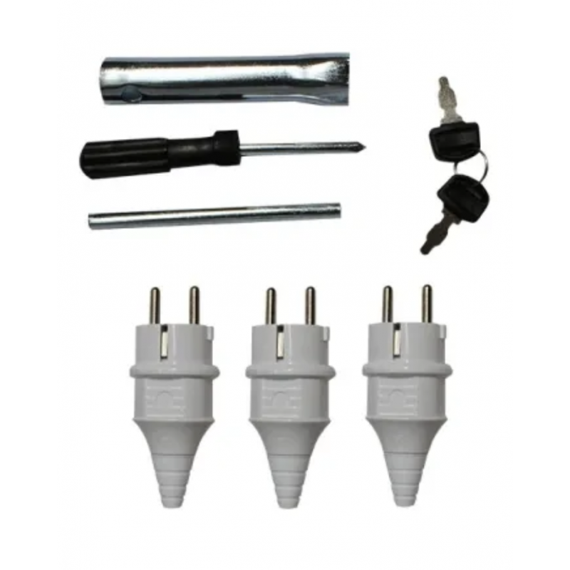 Posee 2 salidas industriales tipo Nema y 1 salida europea con protector. Incluye kit de enchufes y mantenimiento.