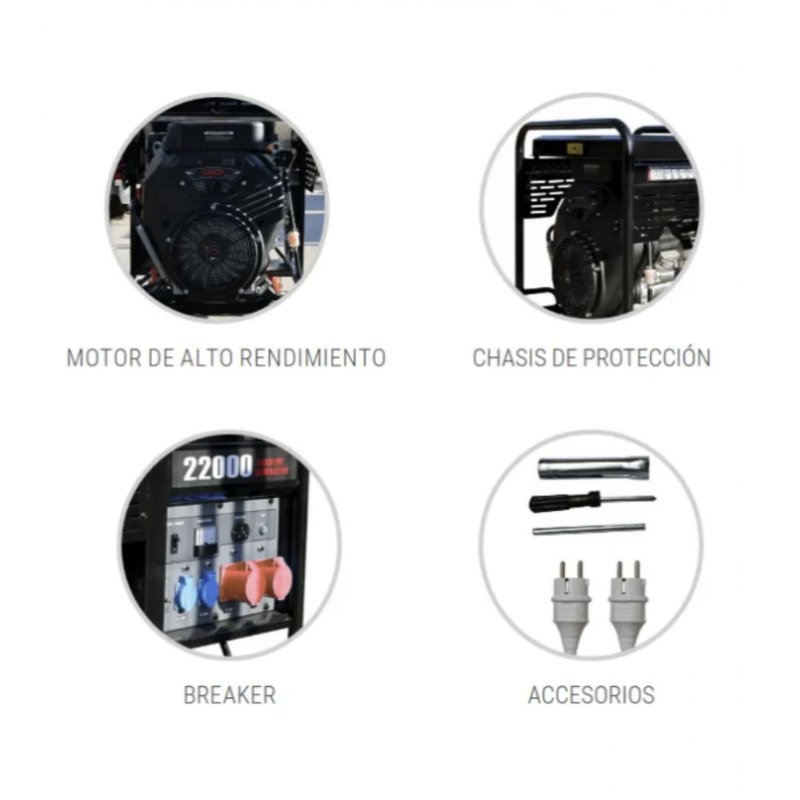 El generador a gasolina LONCIN LC-22000 es un modelo semiprofesional, robusto y versátil, con una potencia nominal de 15 kW y una potencia máxima de 16 kW. Proporciona una energía eléctrica estable que protege sus equipos de posibles daños por fluctuaciones de energía. Es ideal para su uso en obras y arrendamientos. Además, cuenta con una salida monofásica de 3 kW, lo que lo hace aún más versátil y adecuado para una variedad de aplicaciones. Confíe en el generador LONCIN LC-22000 para satisfacer sus necesidades de energía de manera confiable y eficiente.