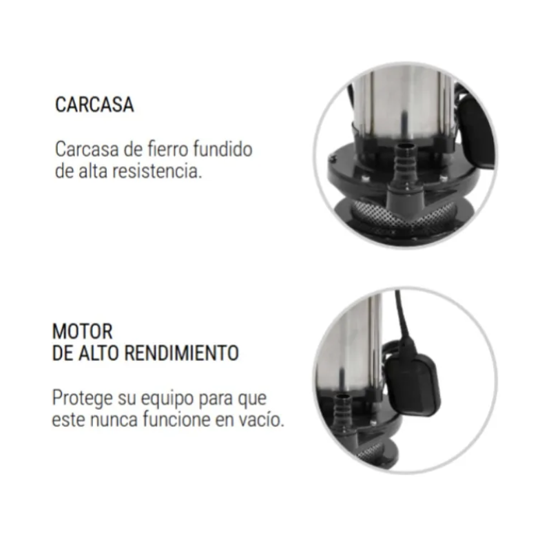 Bomba con canastillo de que filtra las aguas y hace que no se dañe su impulsor, viene con 10 metros de cable y con flotador que protegerá su bomba cuando baje el nivel de agua.