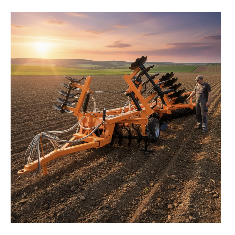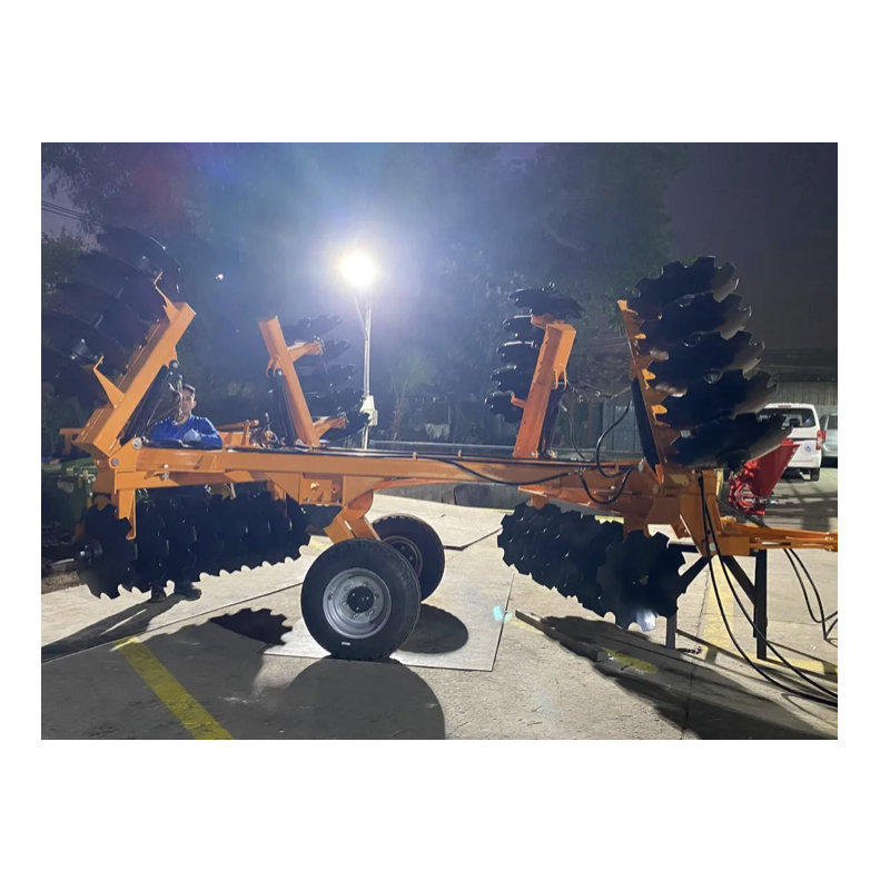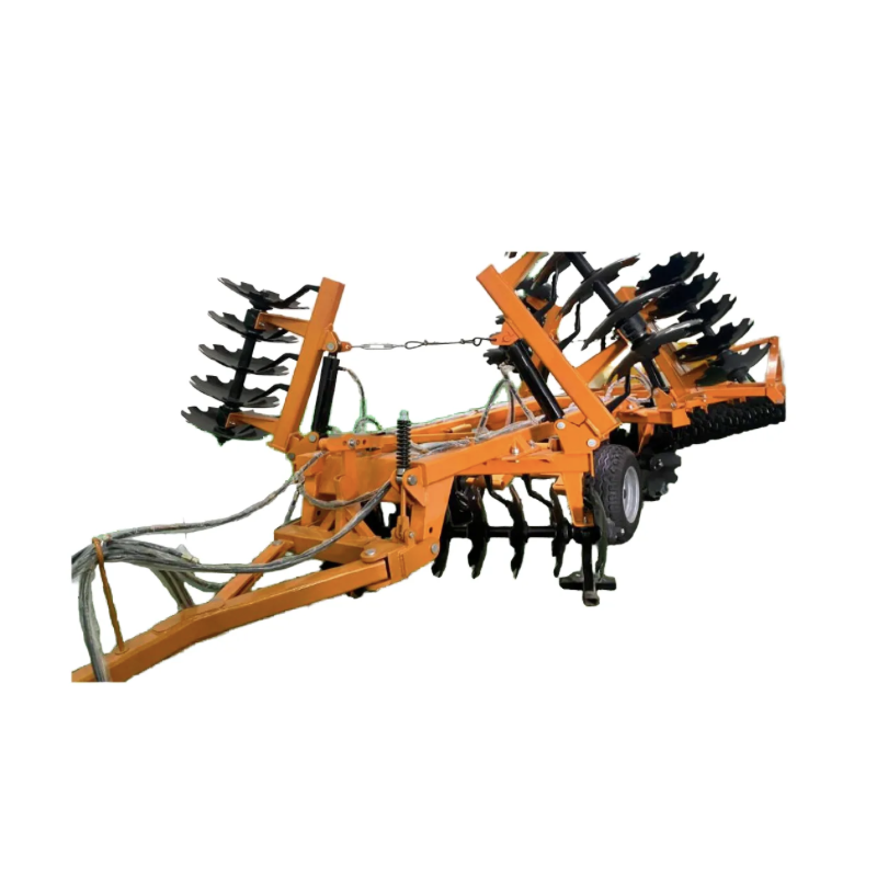Innovadora rastra de tiro tipo plegable con sistema hidráulico para levantar los discos y facilitar el transporte.